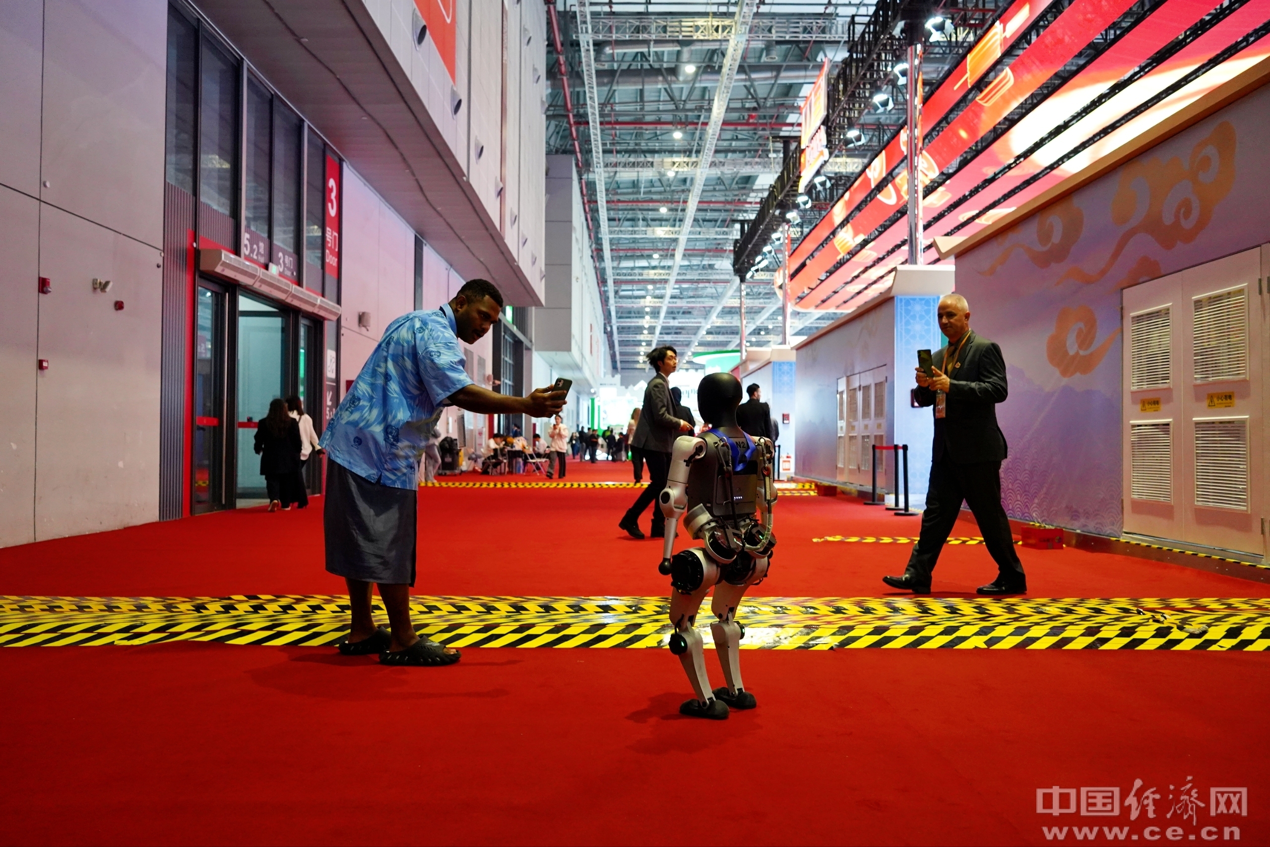 第八届中国国际进口博览会于11月5日至10日在上海举行,各展馆人头攒动。照片显示机器人“走过展览”,参观者停下来拍照。供图:中国经济网记者 马长彦