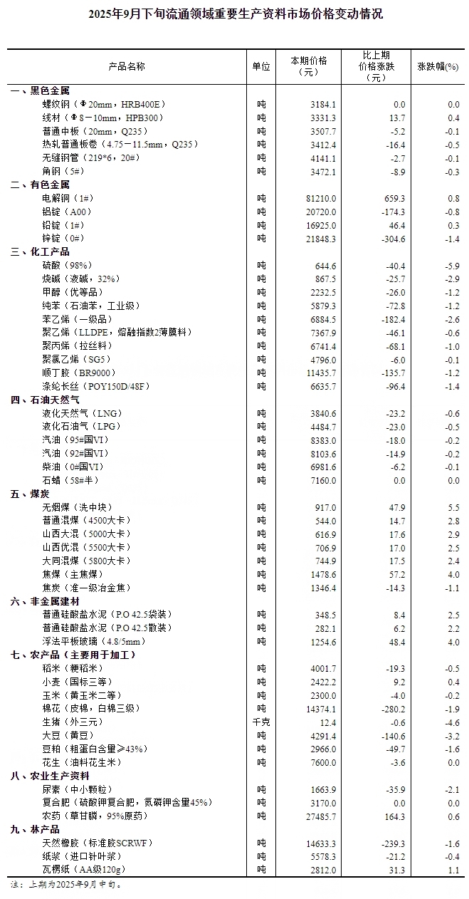 据中国统计信息服务中心卓庄信息,对国内流通领域9大类50种重点生产资料市场价格监测显示,与2025年9月中旬和9月下旬相比,15种产品价格上涨,31种产品价格下降,4种产品价格持平。