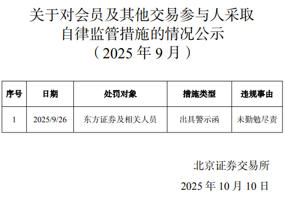 中国经济网北京10月14日电 近日,北京证券交易所网站发布的关于会员及其他交易参与人自律监管措施的公告(2025年9月)显示,北京证券交易所已向东方证券(600958.SH、03958.HK)及关联方发出警示函。违规原因是缺乏尽职调查。